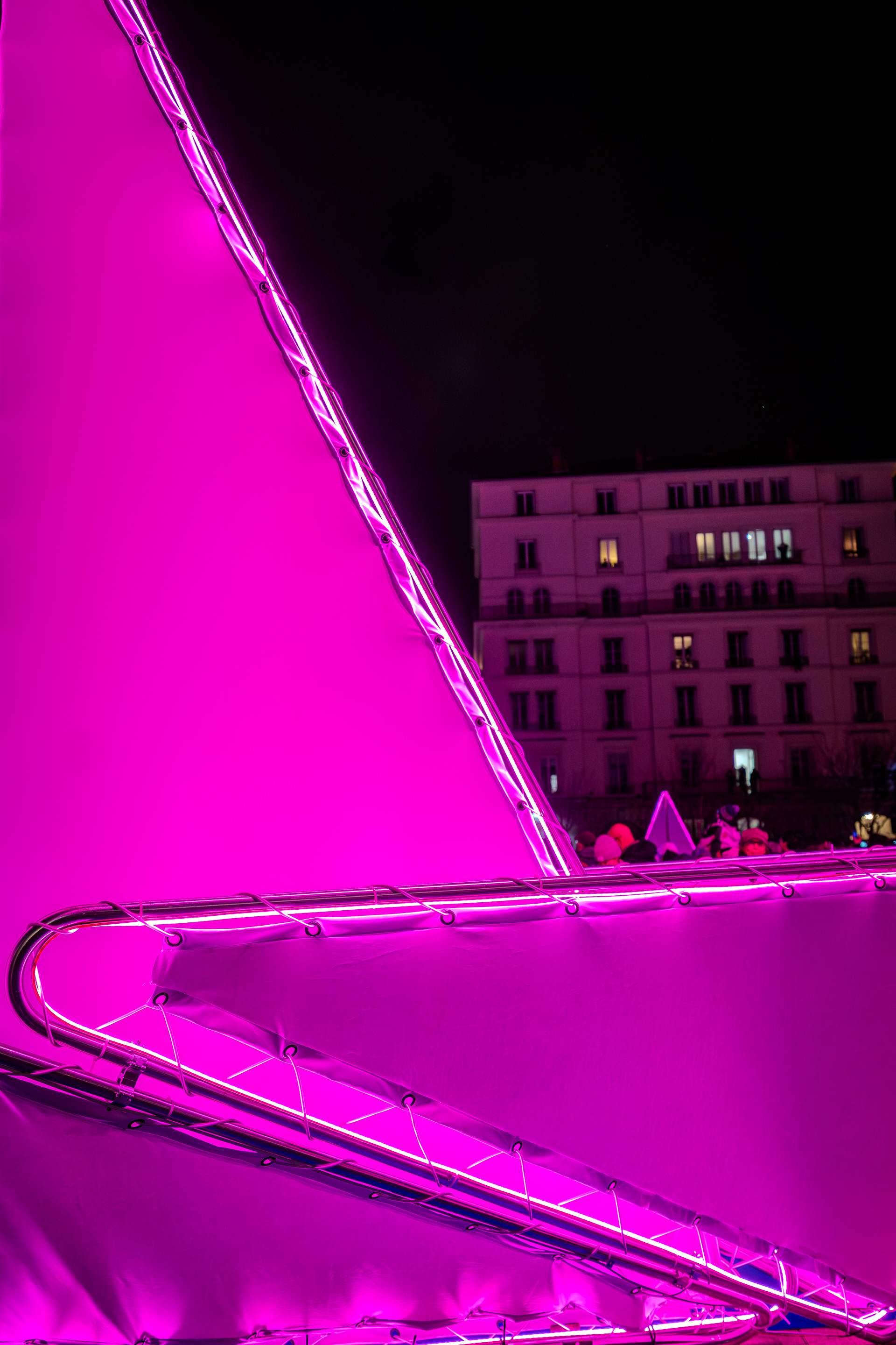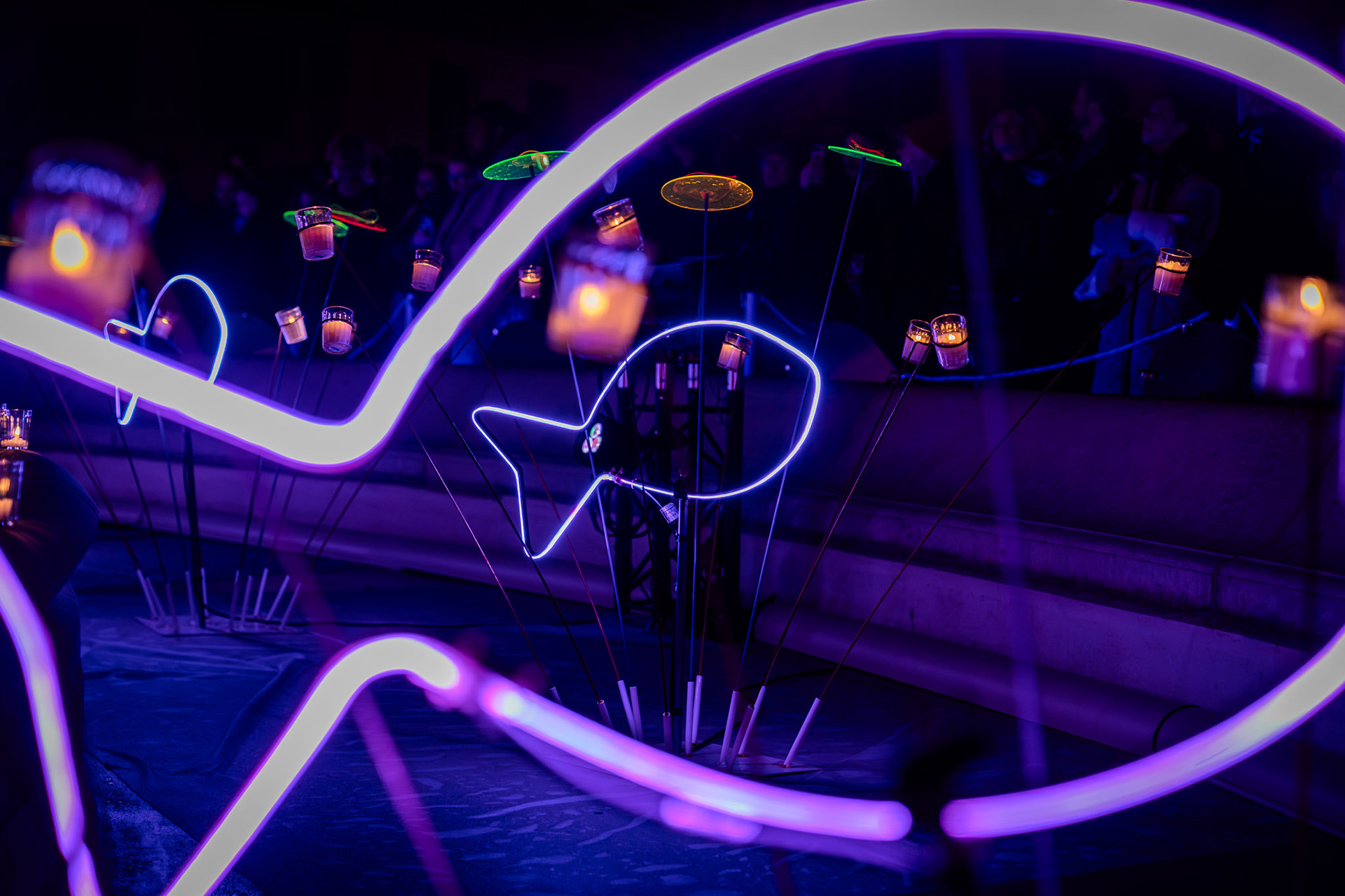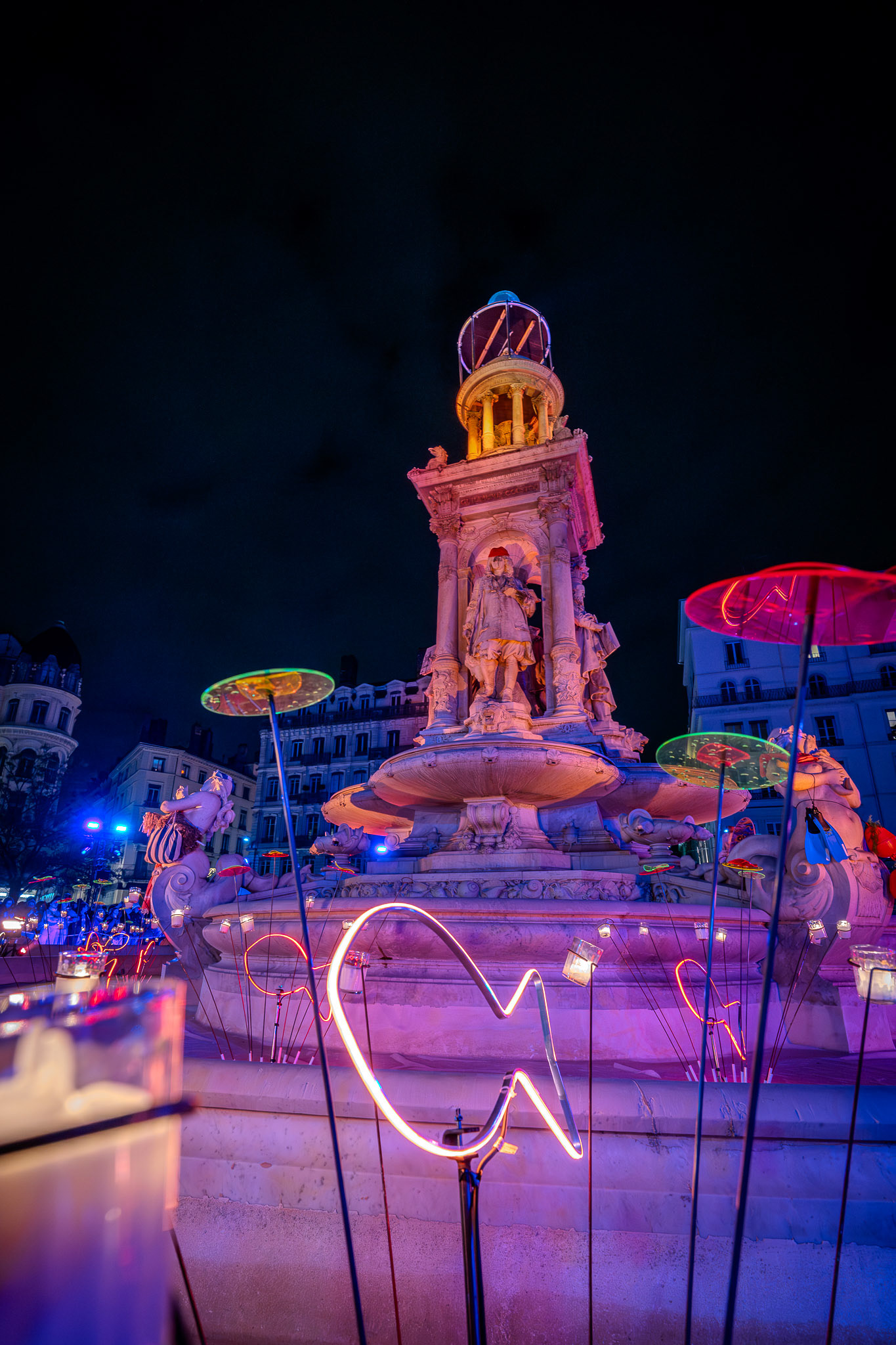 Bateaux et mouettes en origami, poissons lumineux, vagues en linéaires LED se mêlent sur tout le tour de la fontaine pour offrir un moment hors du temps.